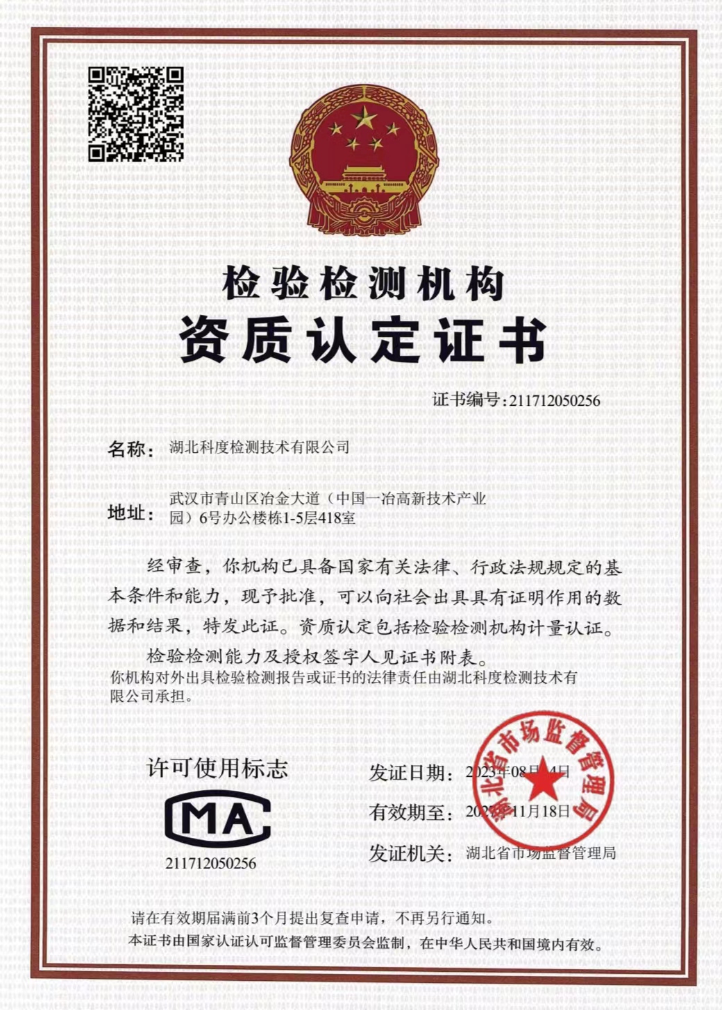湖北科度檢測技術(shù)有限公司是一家專業(yè)從事環(huán)境類及相關(guān)領(lǐng)域檢測的第三方檢測機(jī)構(gòu),公司已通過湖北省市場監(jiān)督管理局CMA計量認(rèn)證,可以面向社會出具權(quán)威CMA檢測報告。 我公司實驗室嚴(yán)格按照國家標(biāo)準(zhǔn)建設(shè),擁有一大批國內(nèi)外先進(jìn)儀器設(shè)備及現(xiàn)代化配套設(shè)施,并有經(jīng)驗豐富的中高級專業(yè)技術(shù)人員和嚴(yán)格的實驗室質(zhì)量保證體系為項目運作提供強(qiáng)力支撐。 作為第三方檢測機(jī)構(gòu),公司始終以高度的社會責(zé)任感經(jīng)營企業(yè),以“公正、嚴(yán)謹(jǐn)、高效”為宗旨,依托專業(yè)的技術(shù)實力為客戶提供專業(yè)優(yōu)質(zhì)檢測服務(wù),受到政府、企業(yè)和社會各界的廣泛關(guān)注和認(rèn)可。